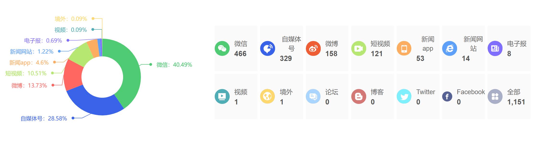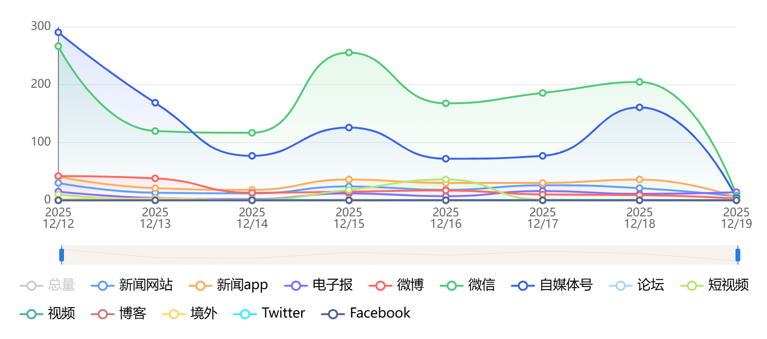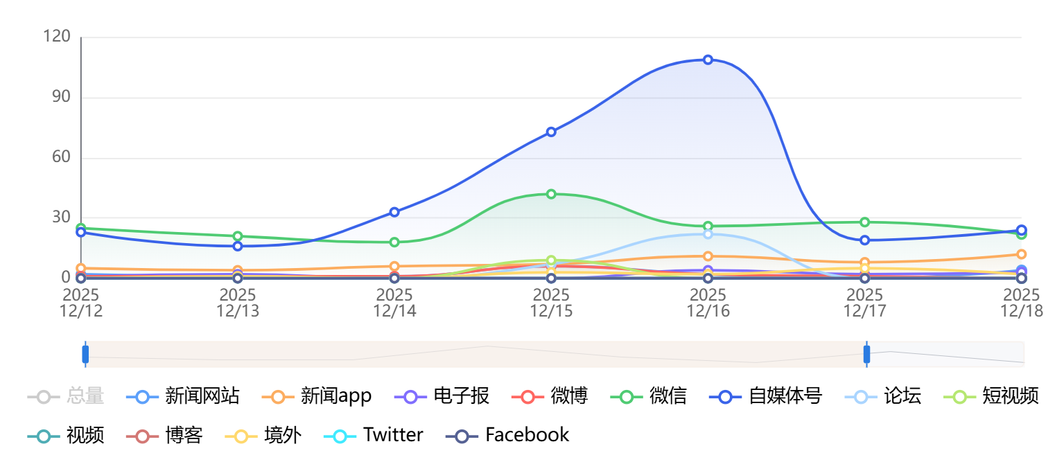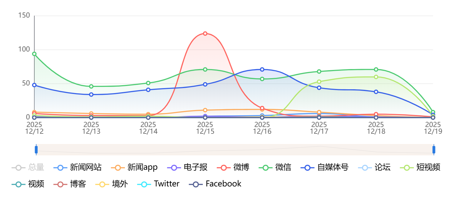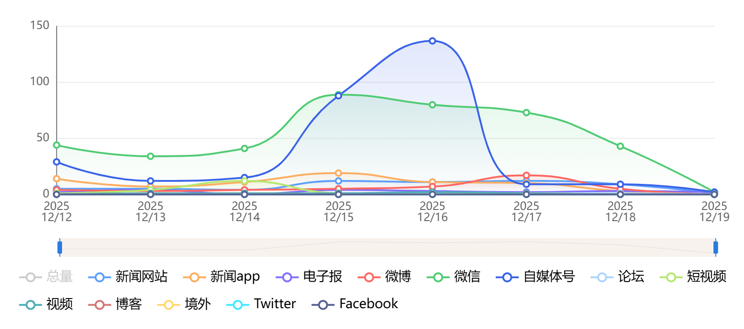 截至目前,该文章在互联网上传播总量为1151篇,其中12月15日是信息发布的高峰期。各信源的信息发布情况中,微信信息占比最大,其次是自媒体号和微博,信息量分别为466篇、329篇、158篇,占比分别为40.49%、28.58%、13.73%。(数据来源:新华睿思系统)