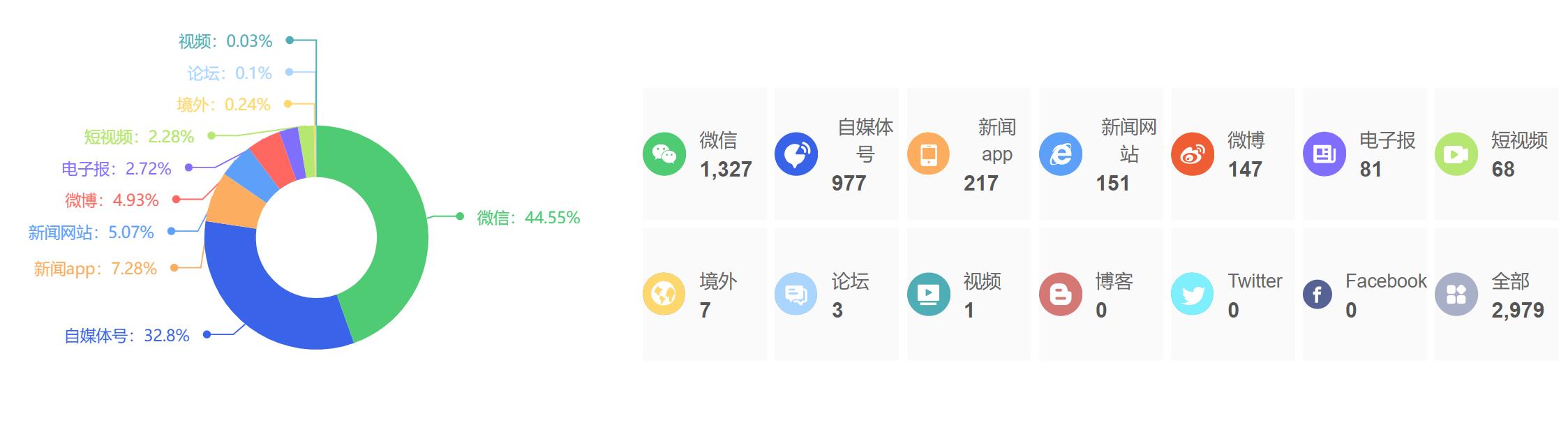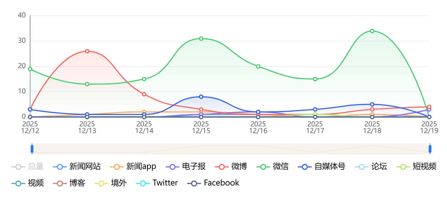 截至目前,该文章在互联网上传播总量为2979篇,其中12月12日是信息发布的高峰期。各信源的信息发布情况中,微信信息占比最大,其次是自媒体号和新闻APP,信息量分别为1327篇、977篇、217篇,占比分别为44.55%、32.8%、7.28%。(数据来源:新华睿思系统)