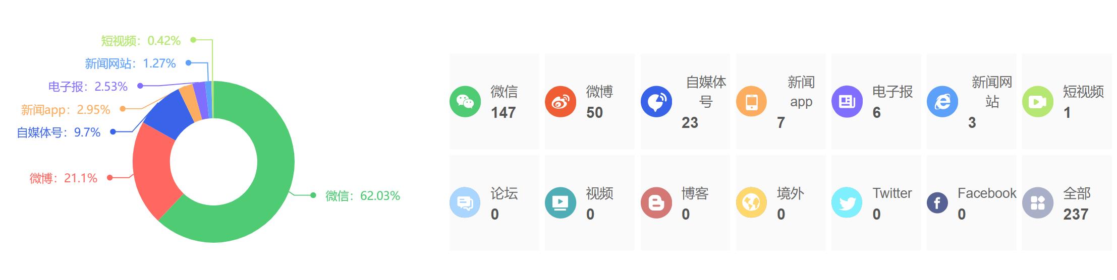 截至目前,该文章在互联网上传播总量为237篇,其中12月18日是信息发布的高峰期。各信源的信息发布情况中,微信信息占比最大,其次是微博和自媒体号,信息量分别为147篇、50篇、23篇,占比分别为62.03%、21.1%、9.7%。(数据来源:新华睿思系统)