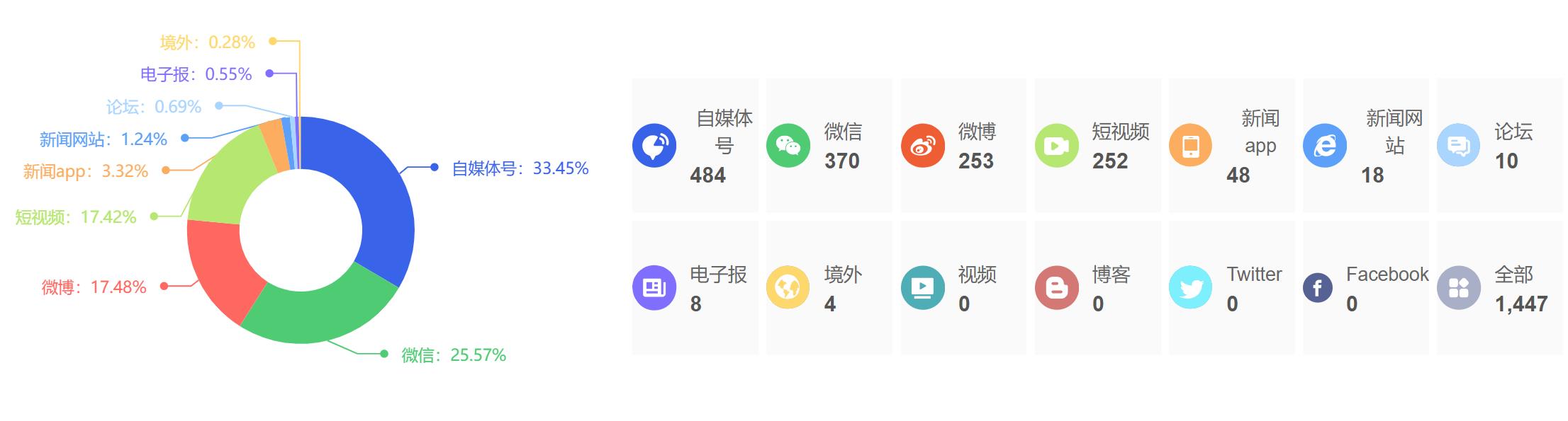 截至目前,该文章在互联网上传播总量为1447篇,其中12月18日是信息发布的高峰期。各信源的信息发布情况中,自媒体号信息占比最大,其次是微信和微博,信息量分别为484篇、370篇、253篇,占比分别为33.45%、25.57%、17.48%。(数据来源:新华睿思系统)