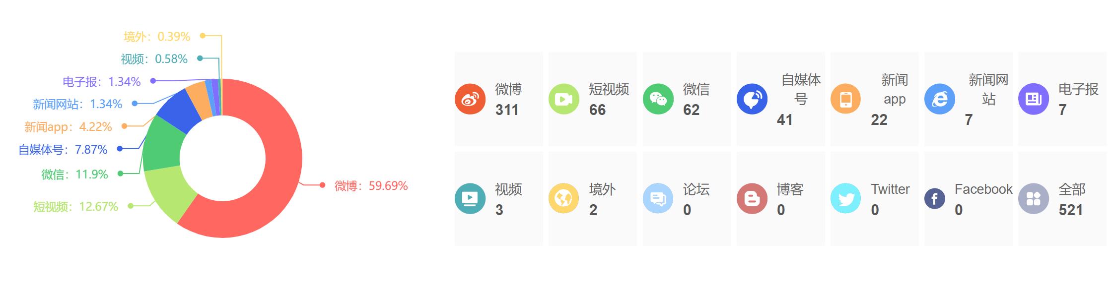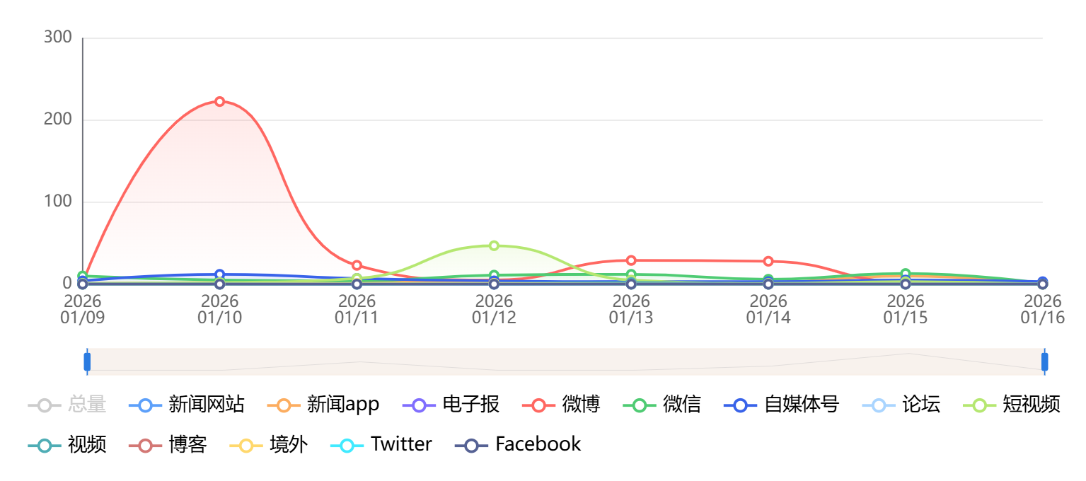 截至目前,该文章在互联网上传播总量为521篇,其中1月10日是信息发布的高峰期。各信源的信息发布情况中,微博信息占比最大,其次是短视频和微信,信息量分别为311篇、66篇、62篇,占比分别为59.69%、12.67%、11.9%。(数据来源:新华睿思系统)
