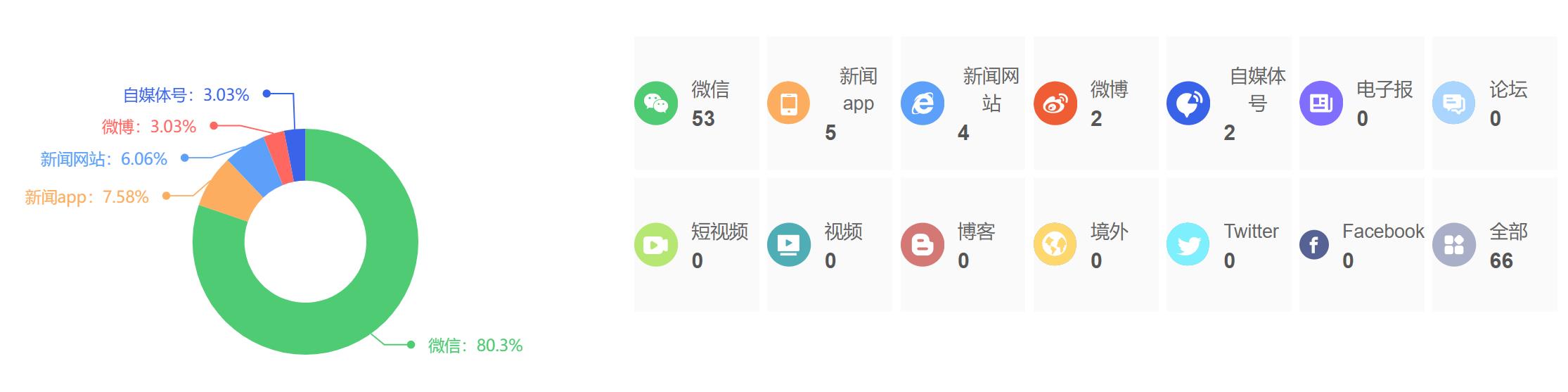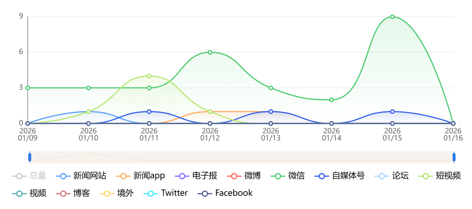 截至目前,该文章在互联网上传播总量为66篇,其中1月9日是信息发布的高峰期。各信源的信息发布情况中,微信信息占比最大,其次是新闻APP和新闻网站,信息量分别为53篇、5篇、4篇,占比分别为80.3%、7.58%、6.06%。(数据来源:新华睿思系统)