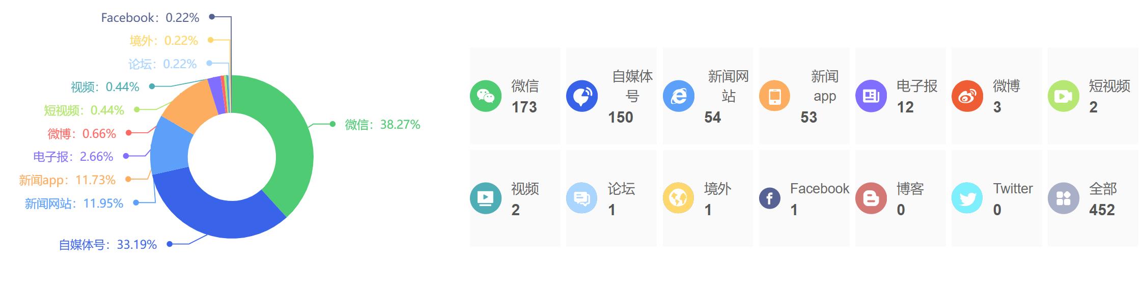 截至目前,该文章在互联网上传播总量为452篇,其中1月9日是信息发布的高峰期。各信源的信息发布情况中,微信信息占比最大,其次是自媒体号和新闻网站,信息量分别为173篇、150篇、54篇,占比分别为38.27%、33.19%、11.95%。(数据来源:新华睿思系统)