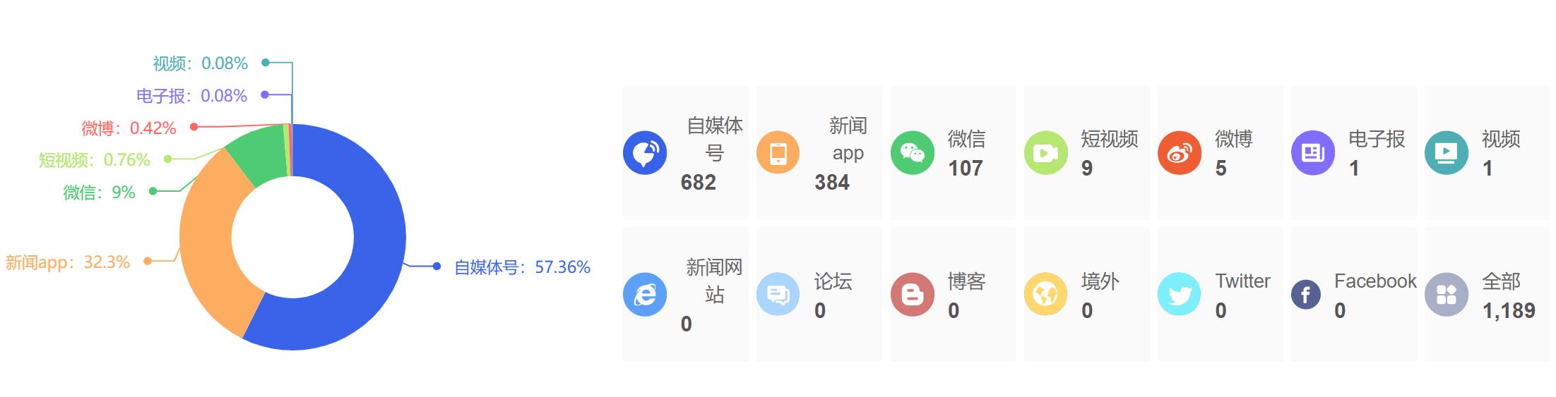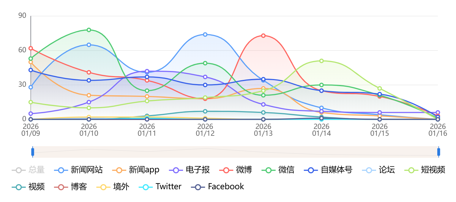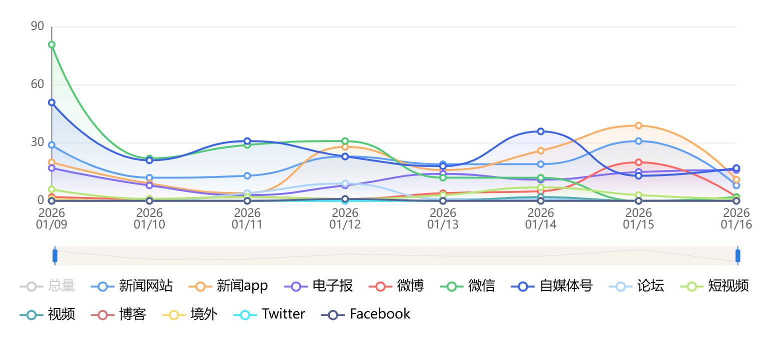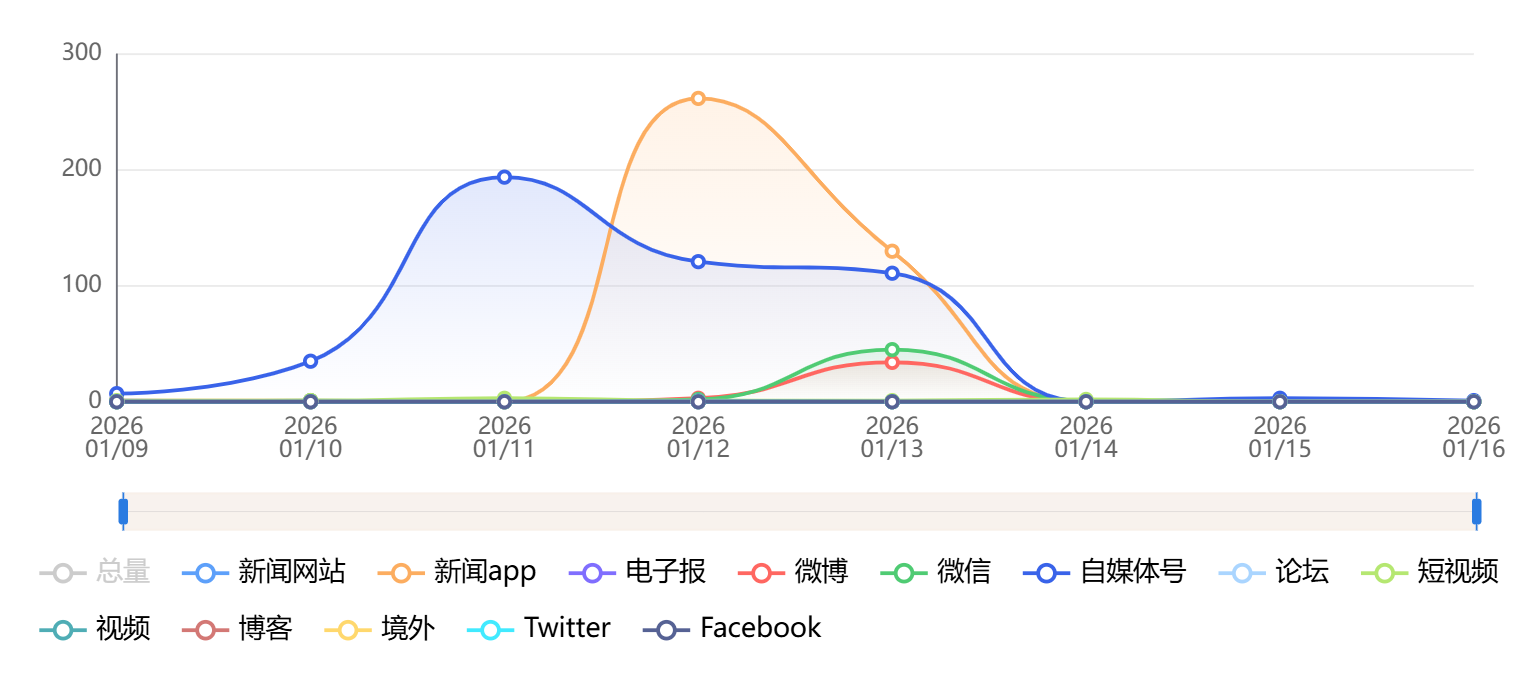 截至目前,该文章在互联网上传播总量为1189篇,其中1月12日是信息发布的高峰期。各信源的信息发布情况中,自媒体号信息占比最大,其次是新闻APP和微信,信息量分别为682篇、384篇、104篇,占比分别为57.36%、32.3%、9%。(数据来源:新华睿思系统)
