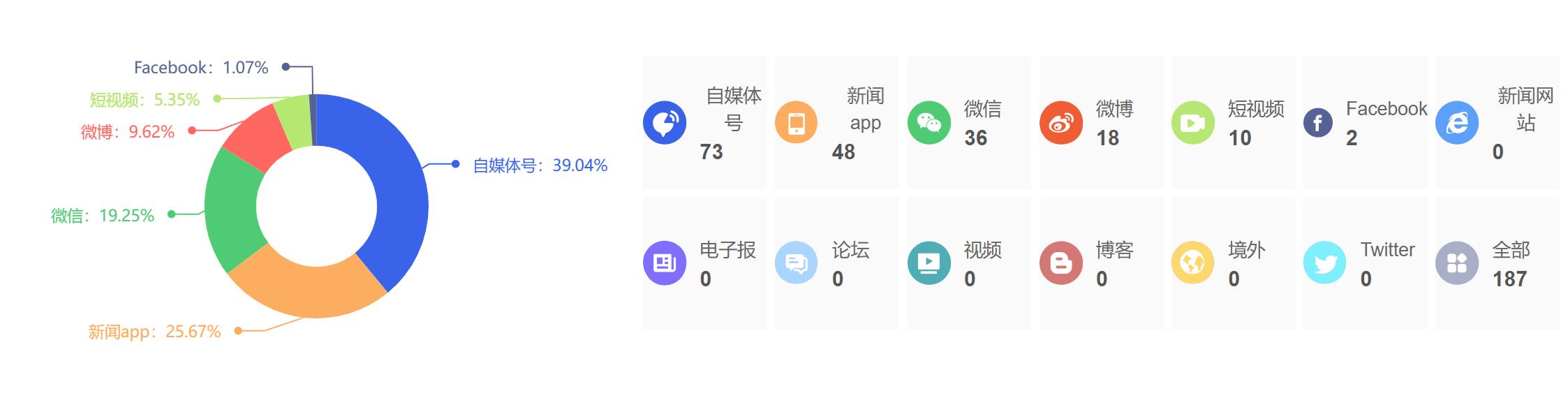 截至目前,该文章在互联网上传播总量为187篇,其中2月12日是信息发布的高峰期。各信源的信息发布情况中,自媒体号信息占比最大,其次是新闻APP和微信,信息量分别为73篇、48篇、36篇,占比分别为39.04%、25.67%、19.25%。(数据来源:新华睿思系统)