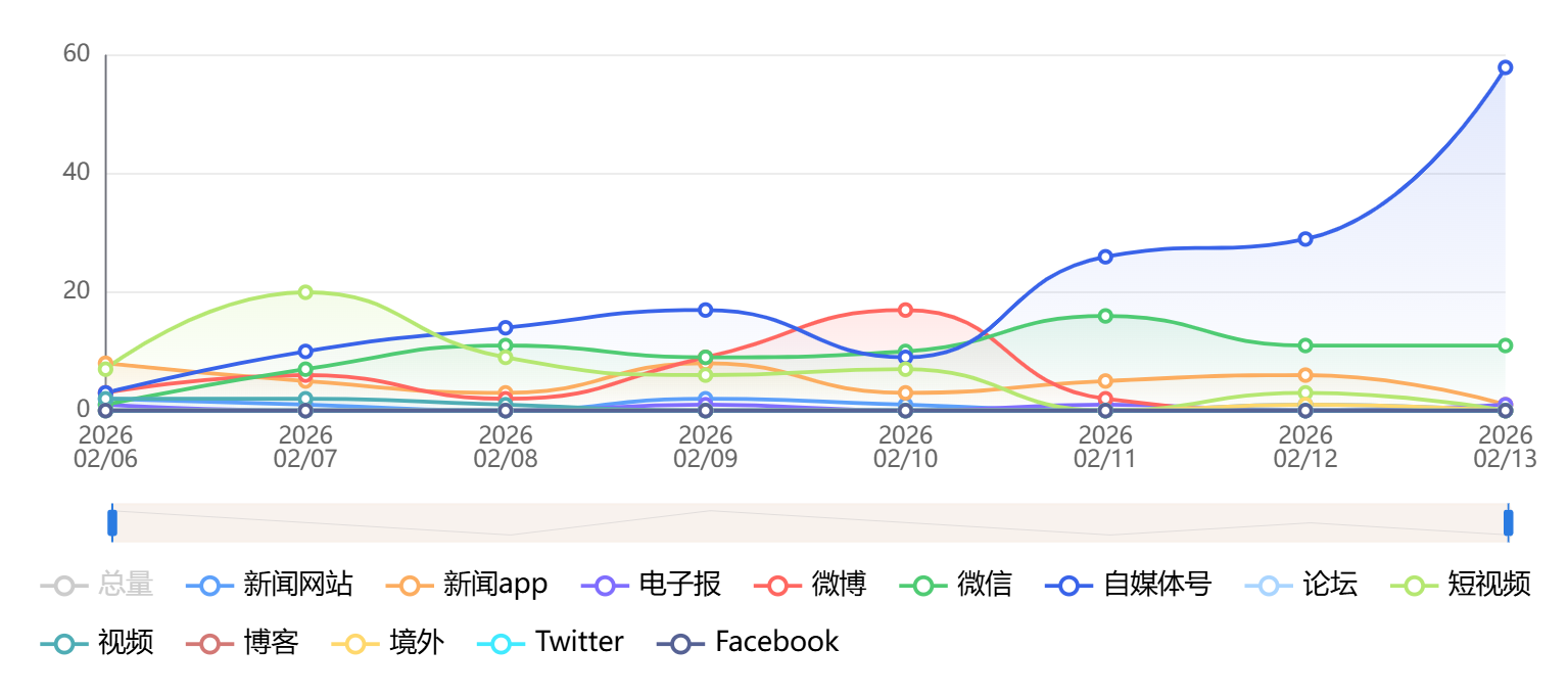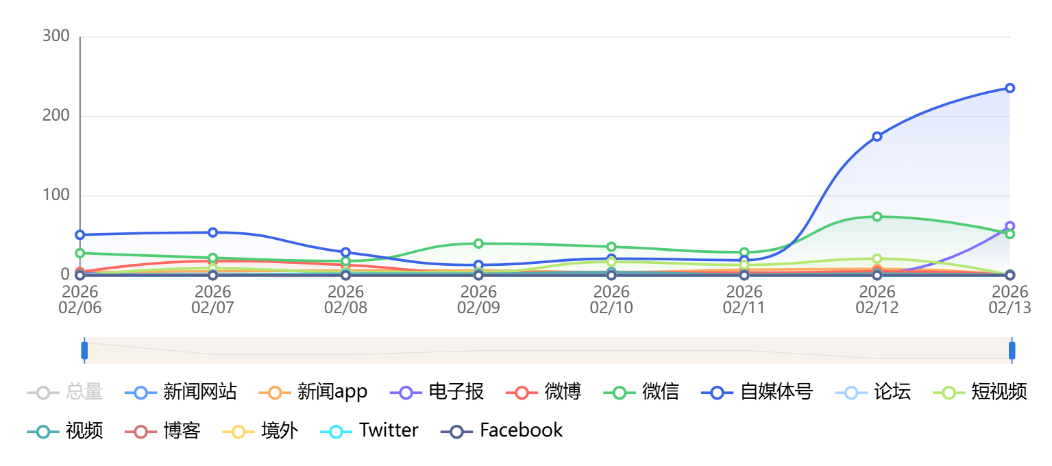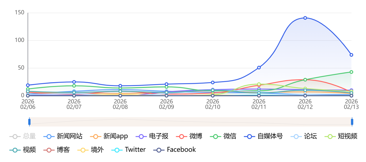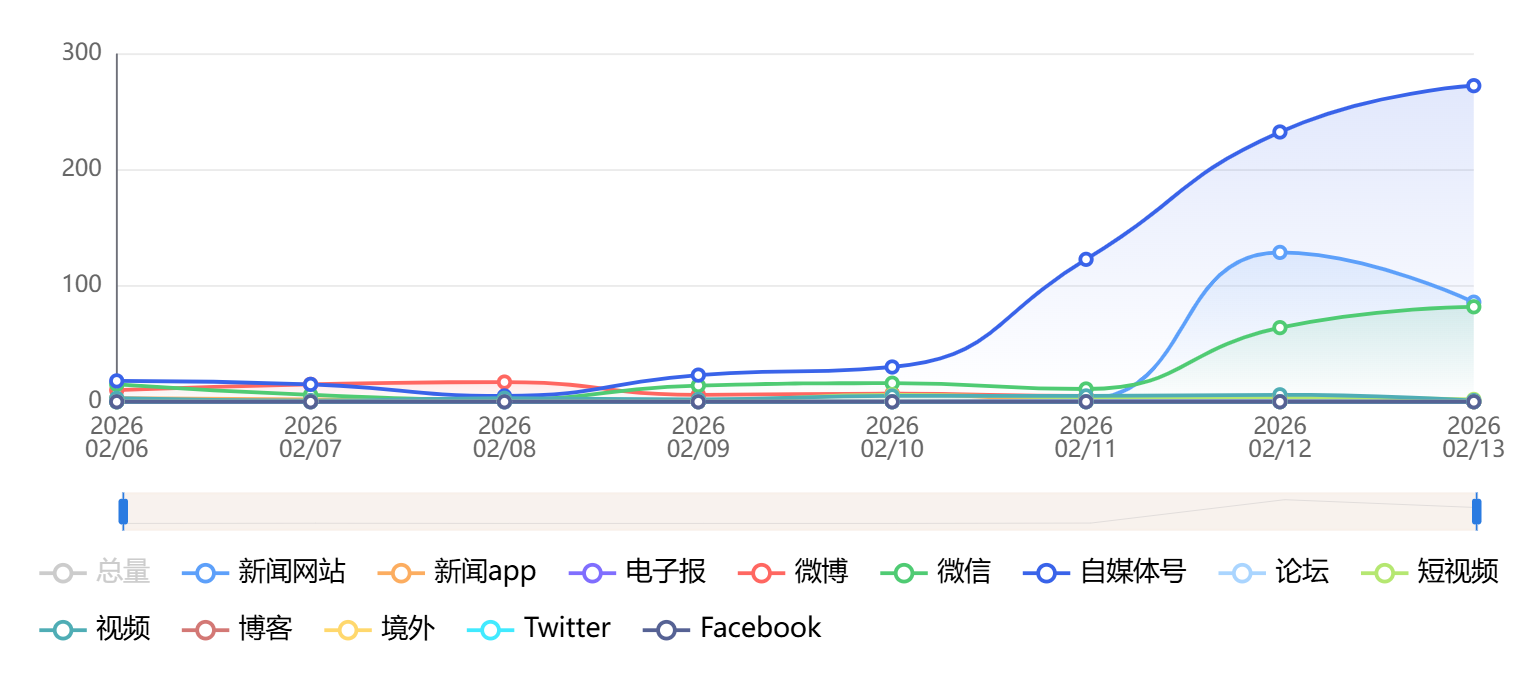 截至目前,该文章在互联网上传播总量为785篇,其中2月13日是信息发布的高峰期。各信源的信息发布情况中,自媒体号信息占比最大,其次是新闻网站和微信,信息量分别为330篇、245篇、80篇,占比分别为42.04%、31.21%、10.19%。(数据来源:新华睿思系统)