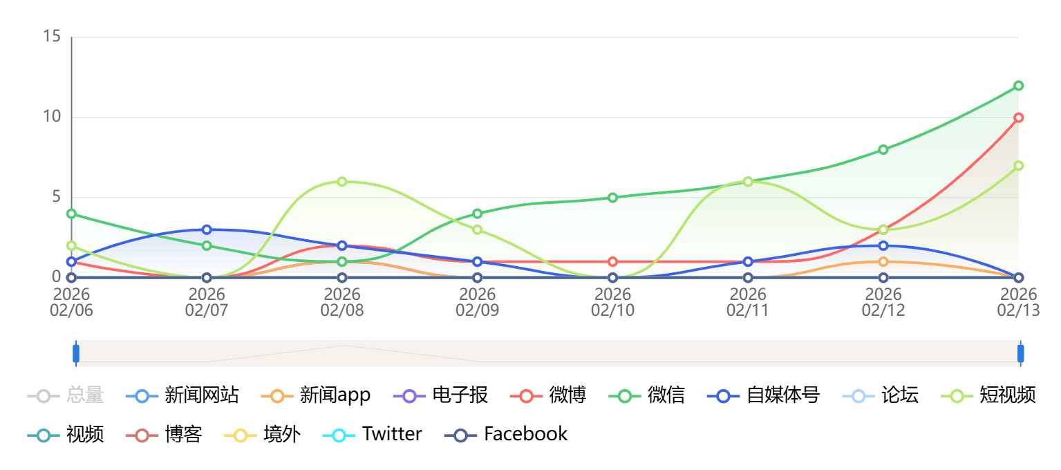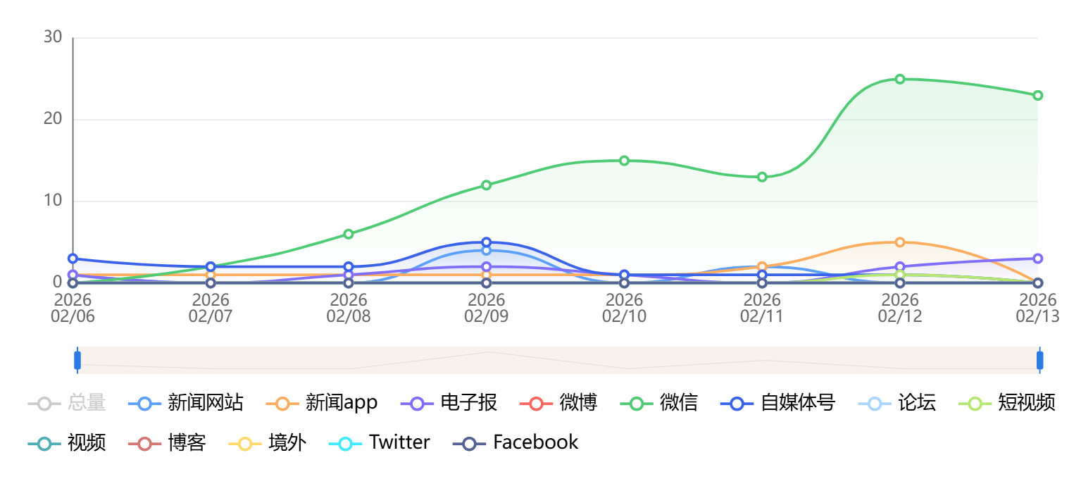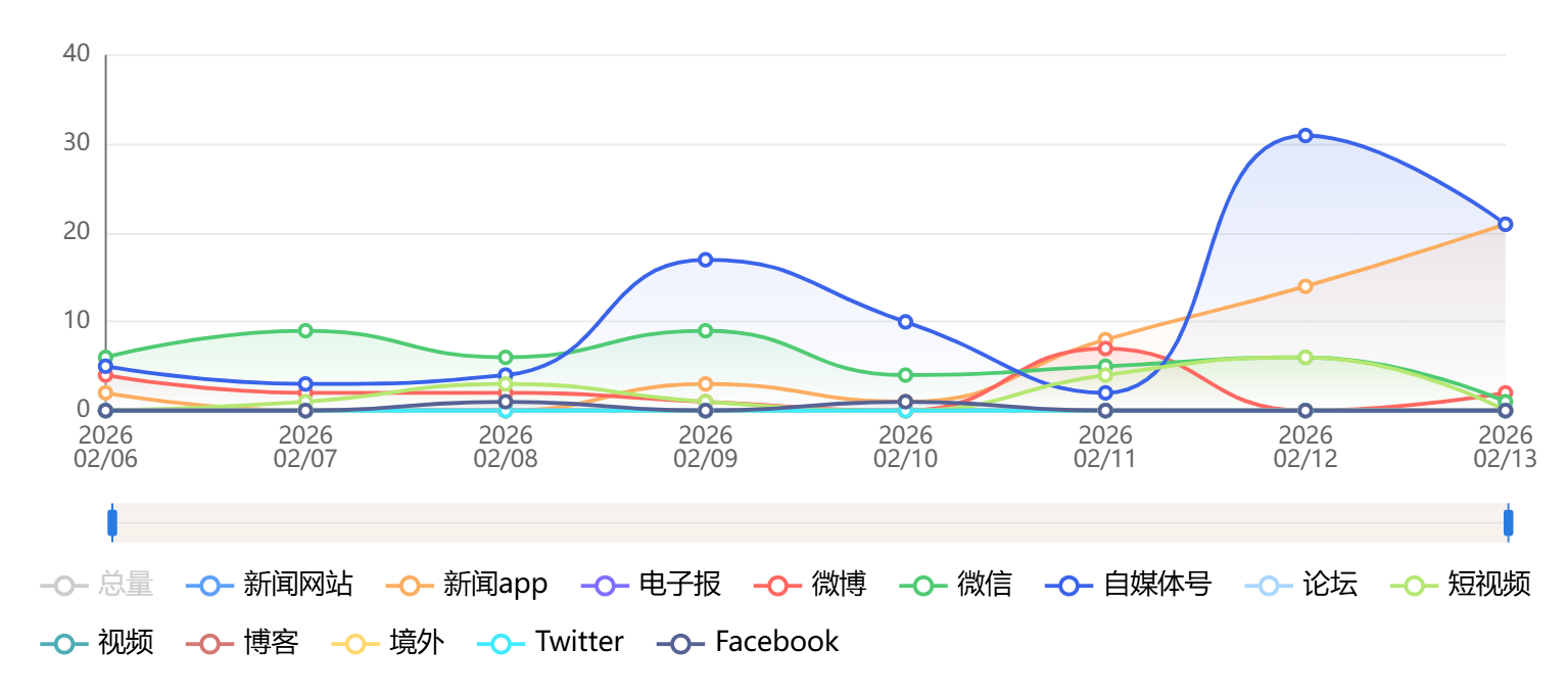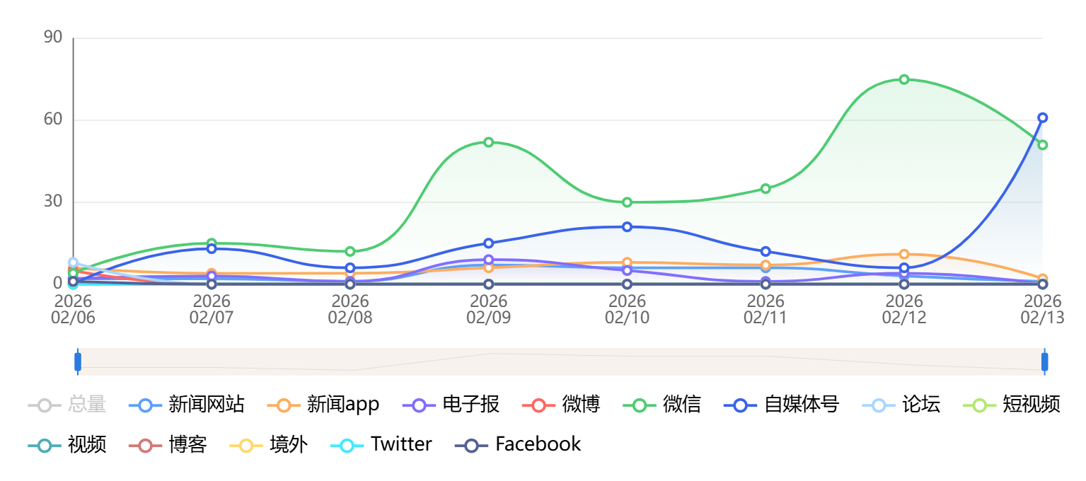 截至目前,该文章在互联网上传播总量为785篇,其中2月13日是信息发布的高峰期。各信源的信息发布情况中,自媒体号信息占比最大,其次是新闻网站和微信,信息量分别为330篇、245篇、80篇,占比分别为42.04%、31.21%、10.19%。(数据来源:新华睿思系统)