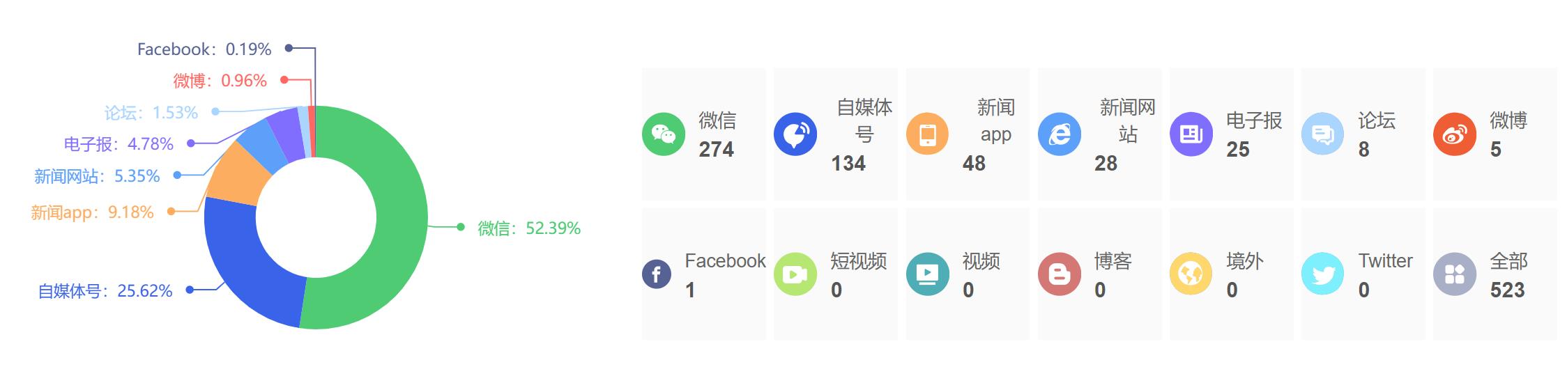 截至目前,该文章在互联网上传播总量为523篇,其中2月12日是信息发布的高峰期。各信源的信息发布情况中,微信信息占比最大,其次是自媒体号和新闻APP,信息量分别为274篇、134篇、48篇,占比分别为52.39%、25.62%、9.18%。(数据来源:新华睿思系统)