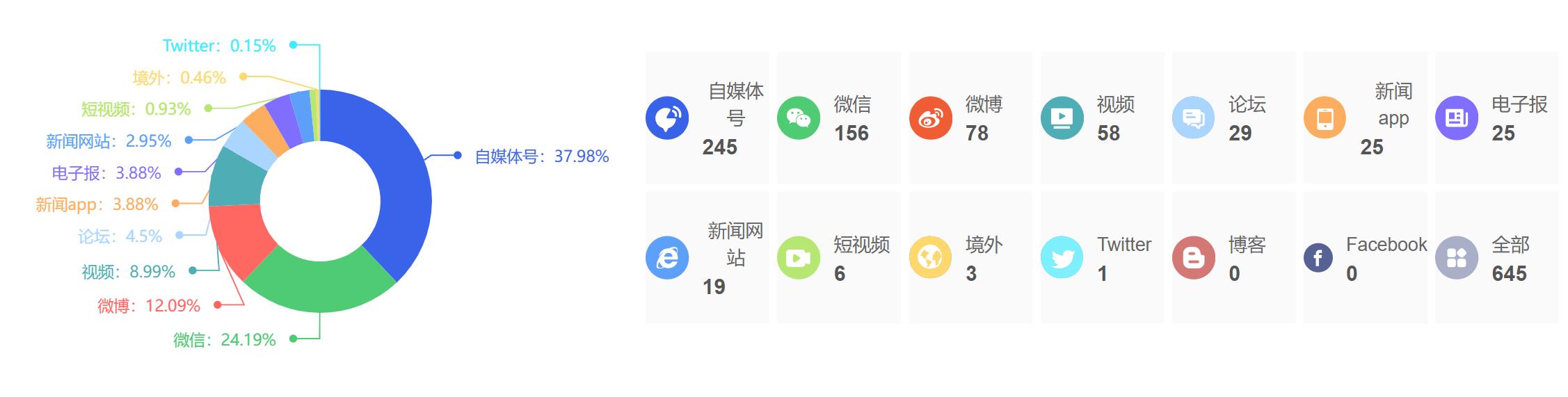截至目前,该文章在互联网上传播总量为645篇,其中2月12日是信息发布的高峰期。各信源的信息发布情况中,自媒体号占比最大,其次是微信和微博,信息量分别为245篇、156篇、78篇,占比分别为37.98%、24.19%、12.09%。(数据来源:新华睿思系统)