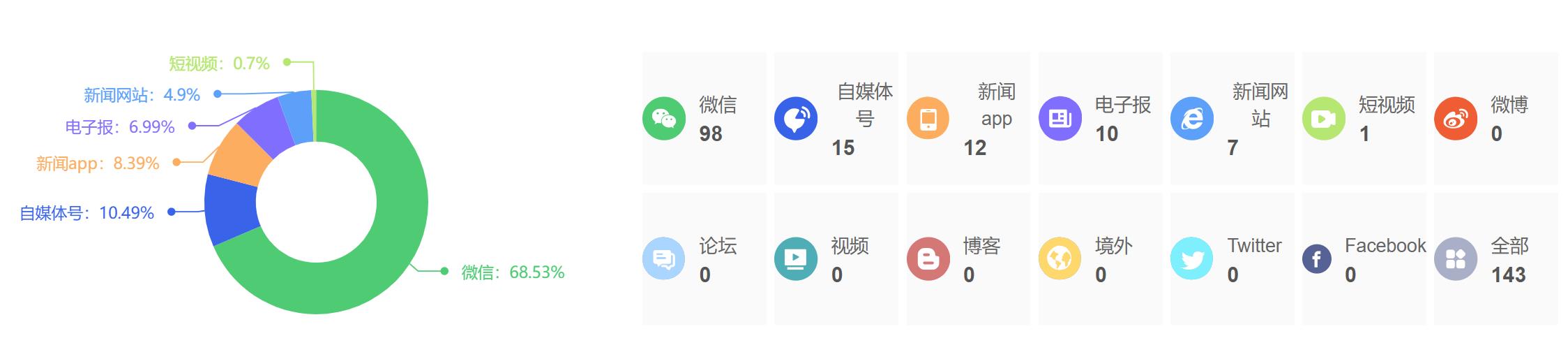 截至目前,该文章在互联网上传播总量为143篇,其中2月12日是信息发布的高峰期。各信源的信息发布情况中,微信信息占比最大,其次是自媒体号和新闻APP,信息量分别为98篇、15篇、12篇,占比分别为68.53%、10.49%、8.39%。(数据来源:新华睿思系统)