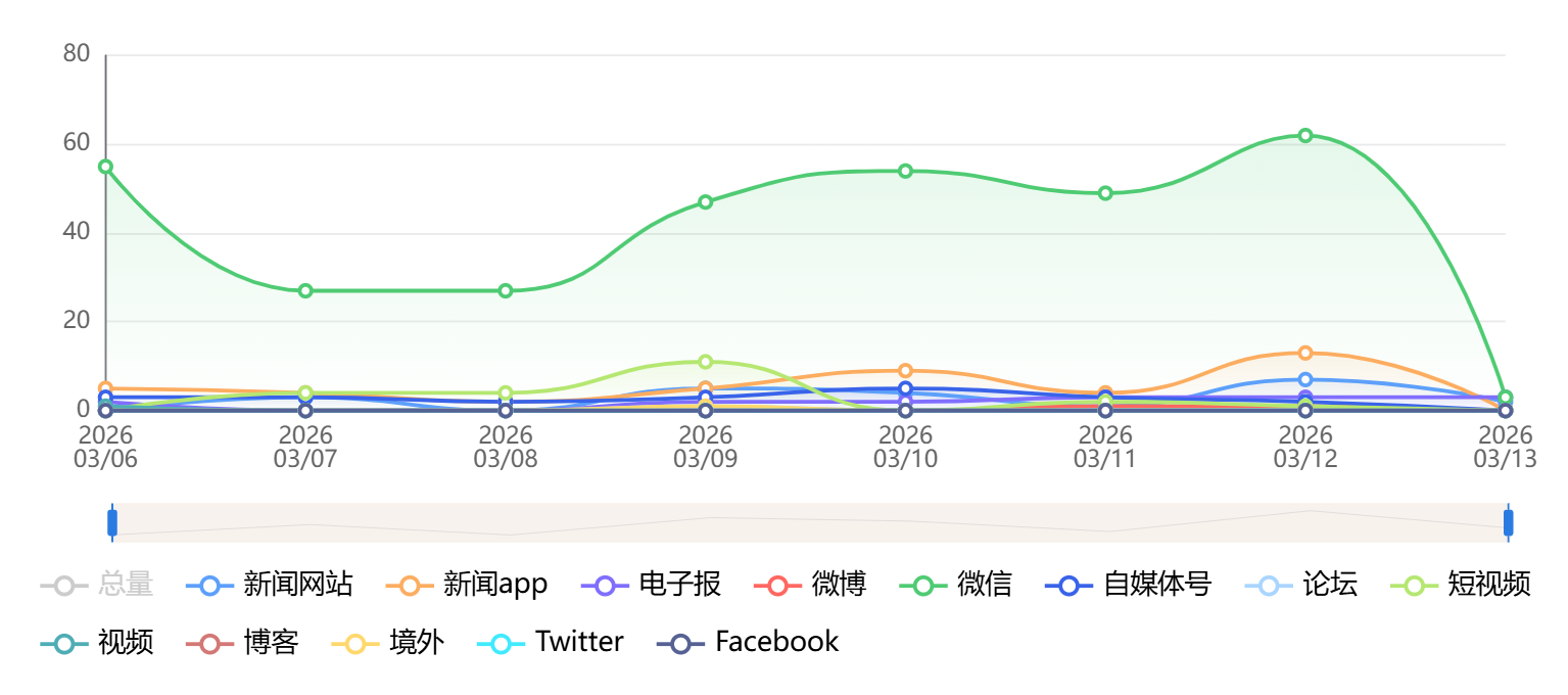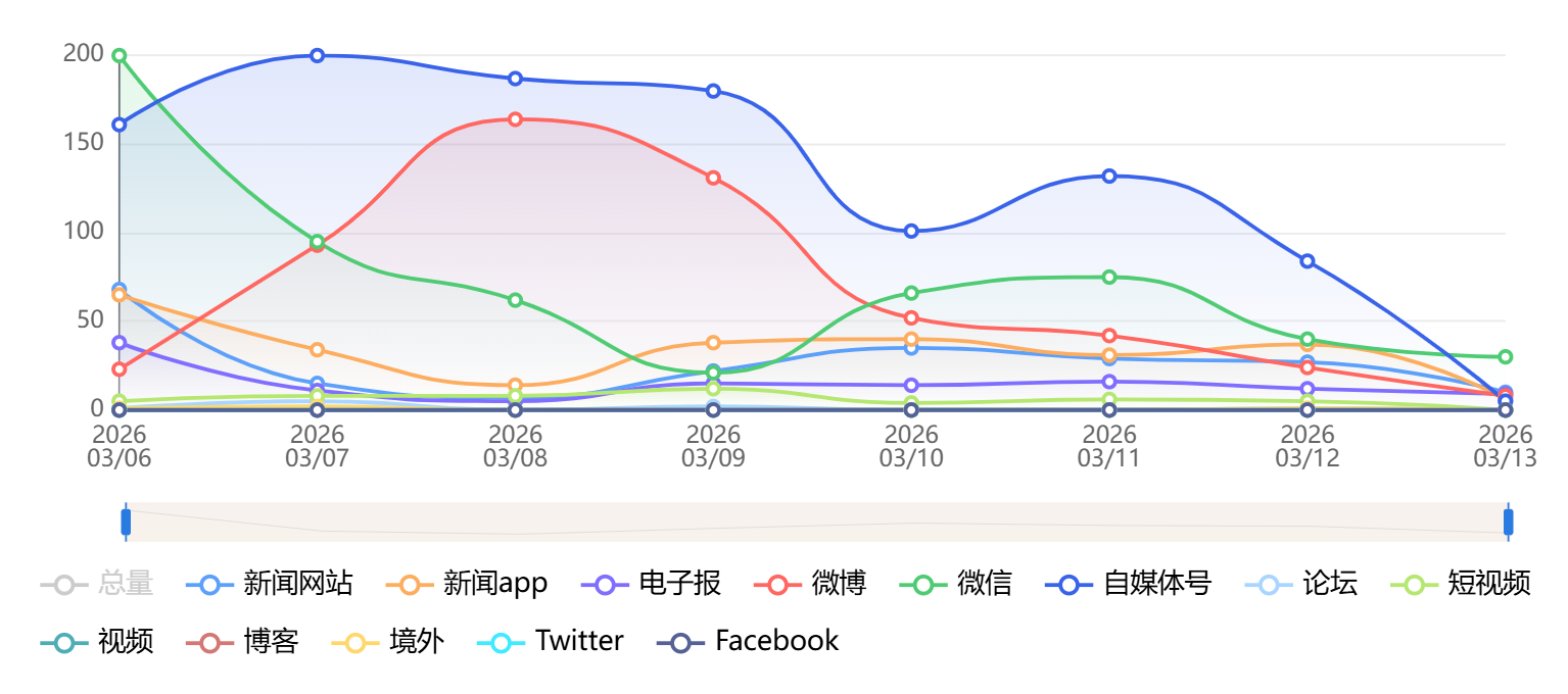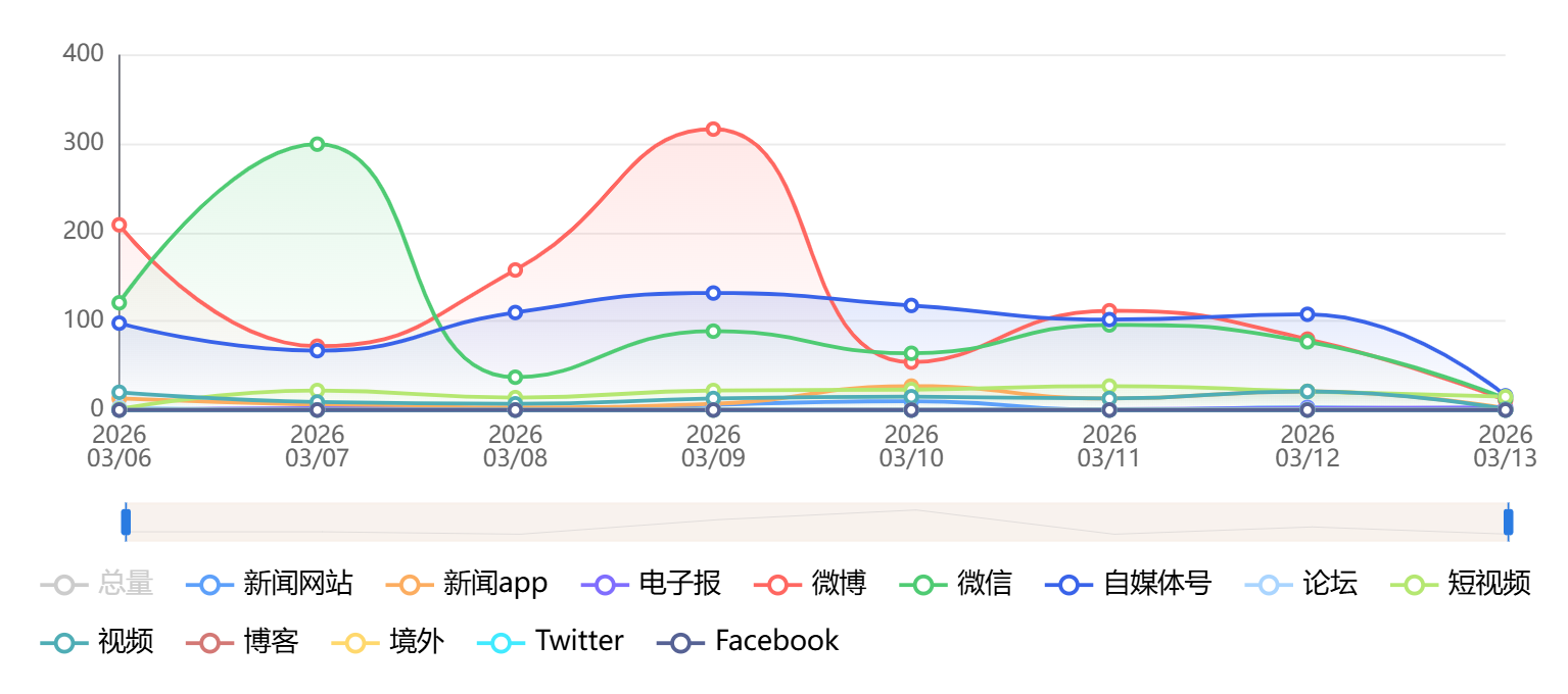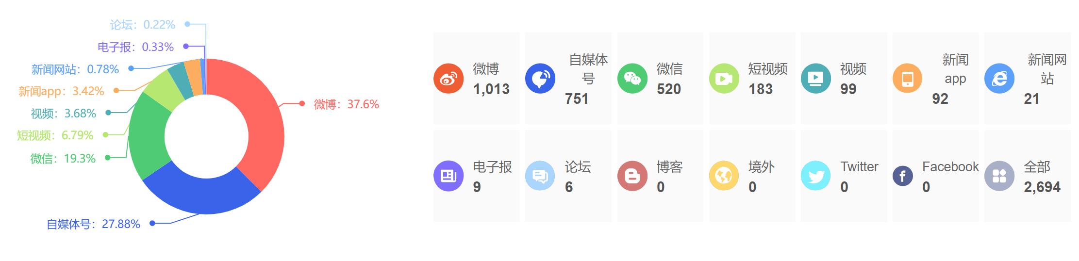 截至目前,该文章在互联网上传播总量为2694篇,其中3月9日是信息发布的高峰期。各信源的信息发布情况中,微博信息占比最大,其次是自媒体号和微信,信息量分别为1013篇、751篇、520篇,占比分别为37.6%、27.88%、19.3%。(数据来源:新华睿思系统)