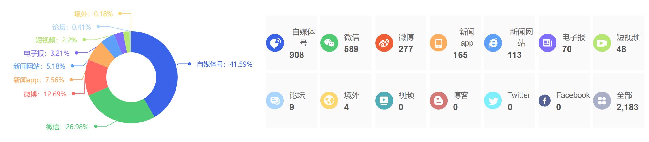 截至目前,该文章在互联网上传播总量为2183篇,其中3月9日是信息发布的高峰期。各信源的信息发布情况中,自媒体号信息占比最大,其次是微信和微博,信息量分别为908篇、589篇、277篇,占比分别为41.59%、26.98%、12.69%。(数据来源:新华睿思系统)