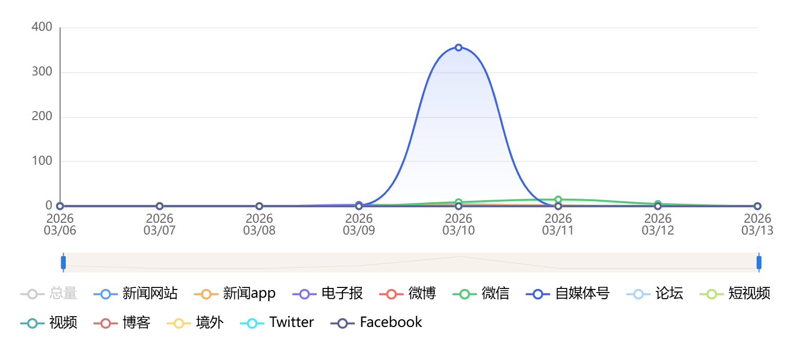 截至目前,该文章在互联网上传播总量为409篇,其中3月10日是信息发布的高峰期。各信源的信息发布情况中,自媒体号信息占比最大,其次是微信和新闻APP,信息量分别为358篇、32篇、7篇,占比分别为87.53%、7.82%、1.71%。(数据来源:新华睿思系统)