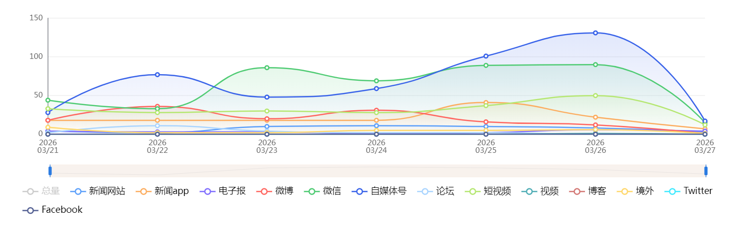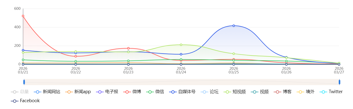 截至目前,该文章在互联网上传播总量为1504篇,其中3月26日是信息发布的高峰期。各信源的信息发布情况中,自媒体号信息占比最大,其次是微信和短视频,信息量分别为461篇、426篇、218篇,占比分别为30.65%、28.32%、14.49%。(数据来源:新华睿思系统)