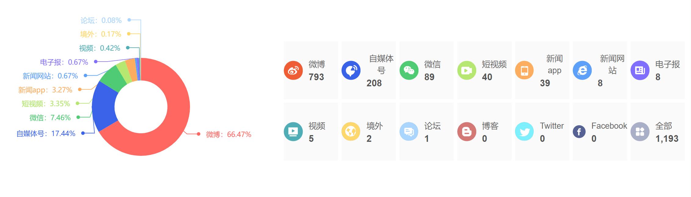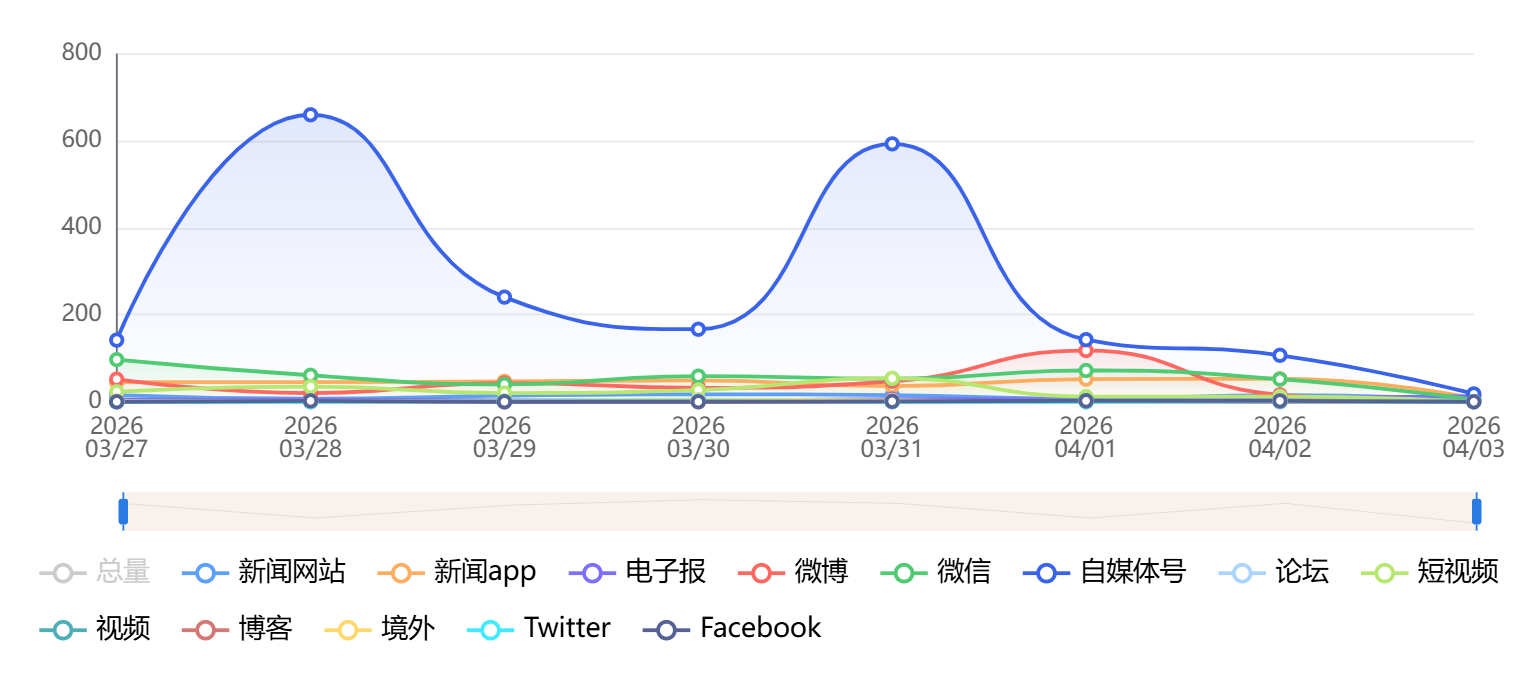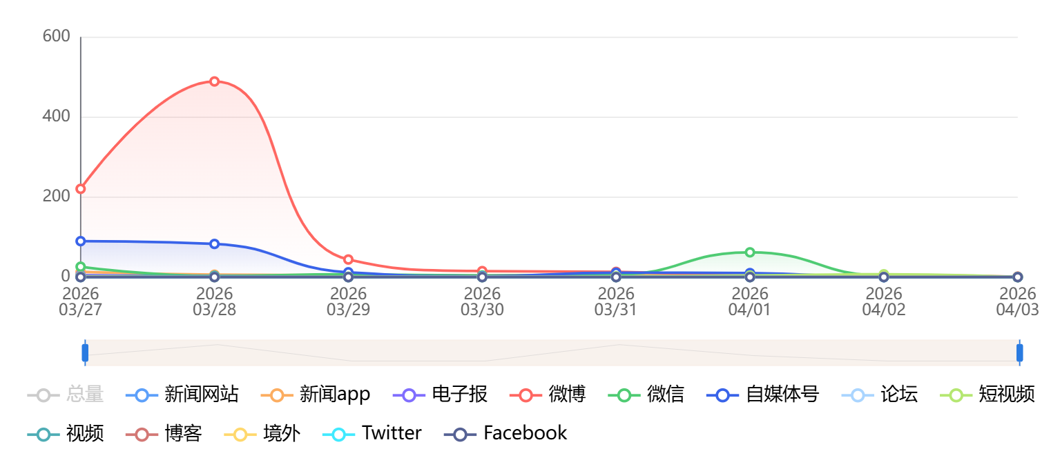 截至目前,该文章在互联网上传播总量为1193篇,其中3月28日是信息发布的高峰期。各信源的信息发布情况中,微博信息占比最大,其次是自媒体号和短视频,信息量分别为793篇、208篇、89篇,占比分别为66.47%、17.44%、7.46%。(数据来源:新华睿思系统)