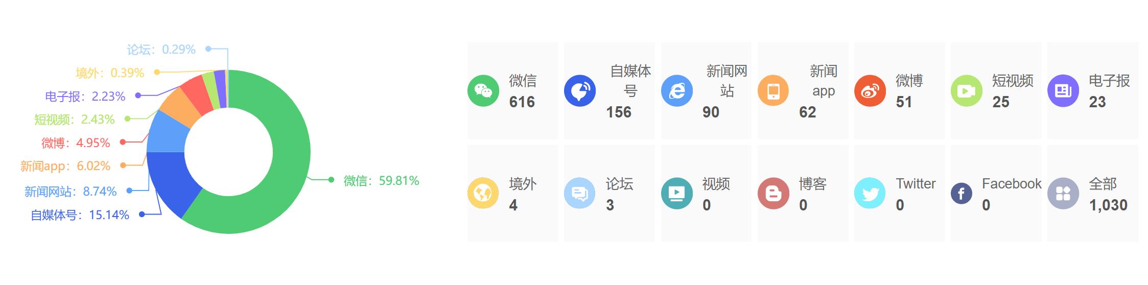 截至目前,该文章在互联网上传播总量为1030篇,其中3月31日是信息发布的高峰期。各信源的信息发布情况中,微信信息占比最大,其次是自媒体号和新闻网站,信息量分别为616篇、156篇、90篇,占比分别为59.81%、15.14%、8.74%。(数据来源:新华睿思系统)