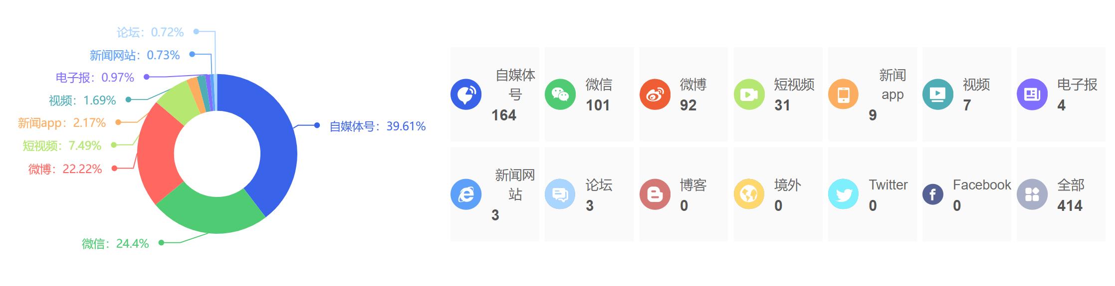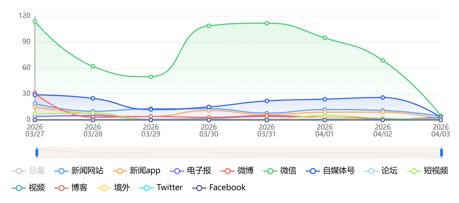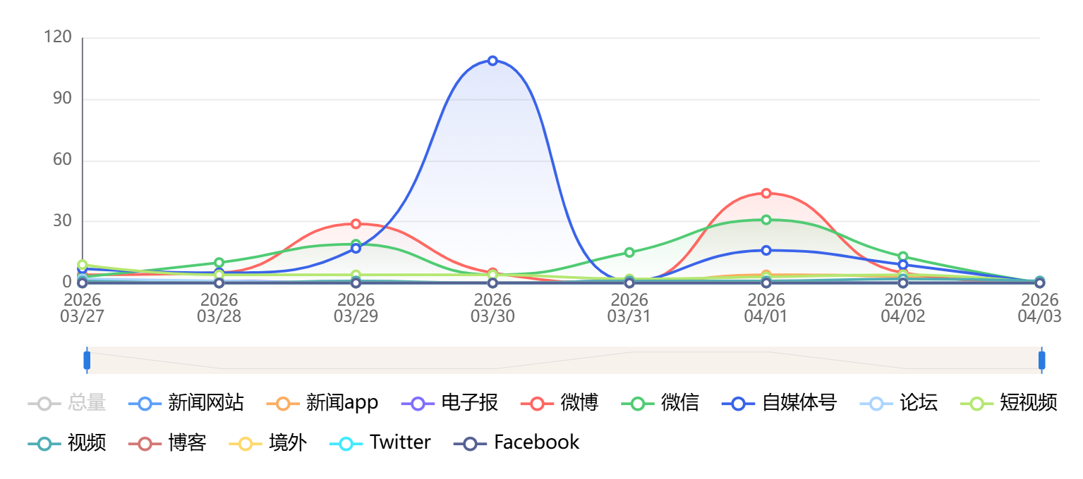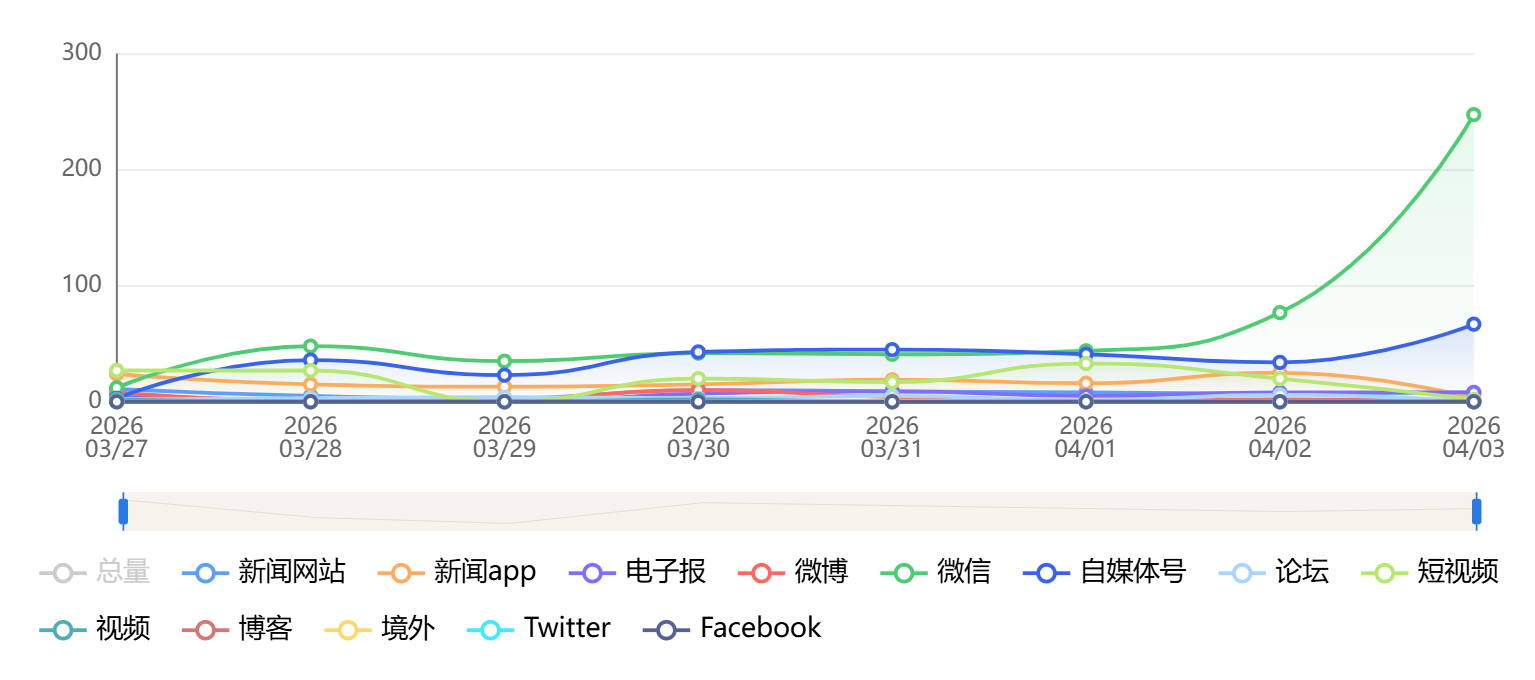 截至目前,该文章在互联网上传播总量为414篇,其中3月30日是信息发布的高峰期。各信源的信息发布情况中,自媒体号信息占比最大,其次是微信和微博,信息量分别为160篇、101篇、92篇,占比分别为39.61%、24.4%、22.22%。(数据来源:新华睿思系统)