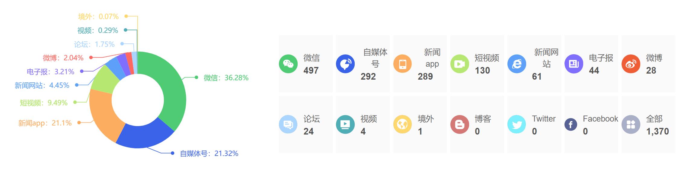 截至目前,该文章在互联网上传播总量为1370篇,其中4月3日是信息发布的高峰期。各信源的信息发布情况中,微信信息占比最大,其次是自媒体号和新闻APP,信息量分别为497篇、292篇、289篇,占比分别为36.28%、21.32%、21.1%。(数据来源:新华睿思系统)