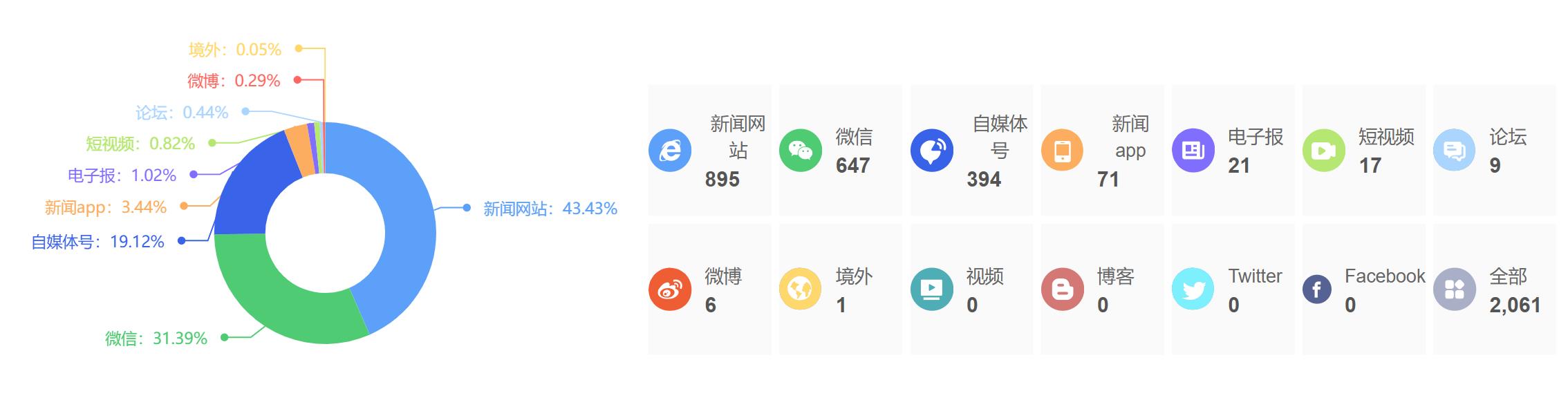 截至目前,该文章在互联网上传播总量为2061篇,其中3月31日是信息发布的高峰期。各信源的信息发布情况中,新闻网站信息占比最大,其次是微信和自媒体号,信息量分别为895篇、647篇、394篇,占比分别为43.43%、31.39%、19.12%。(数据来源:新华睿思系统)