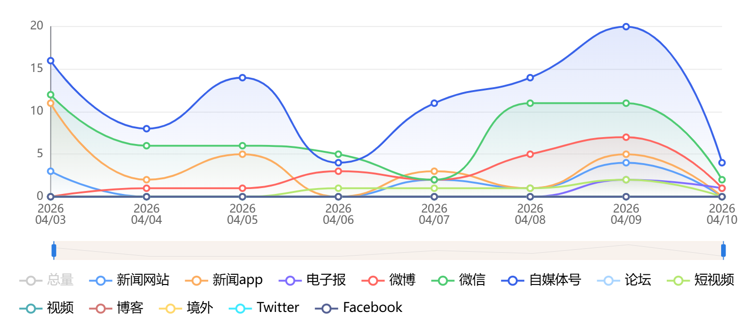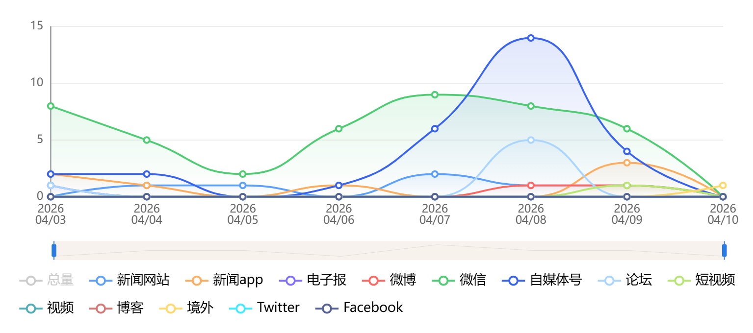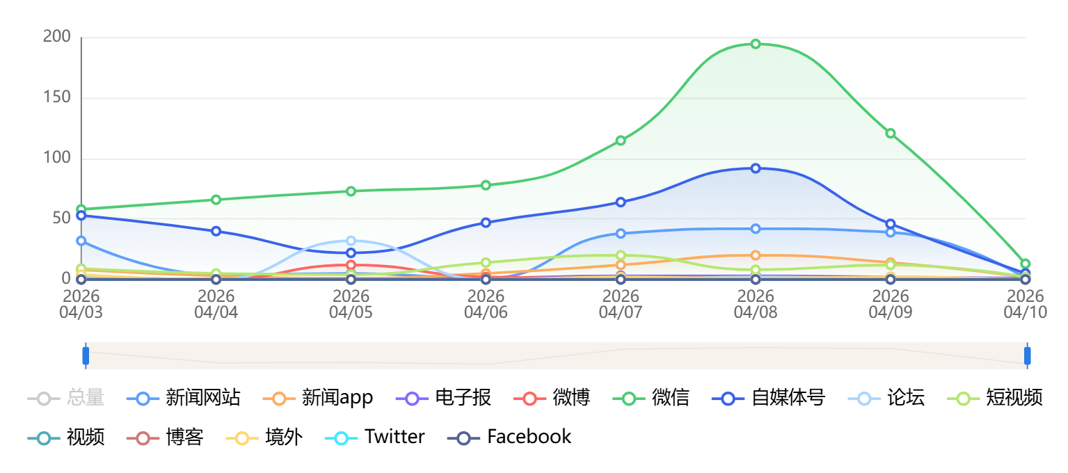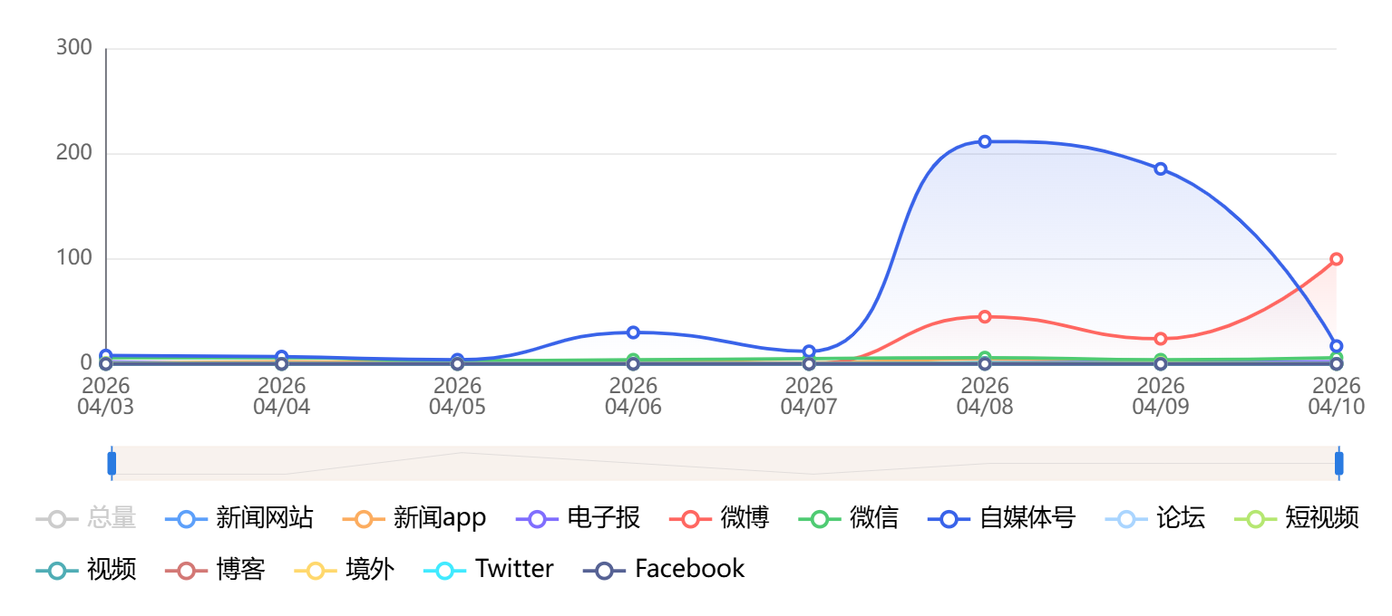 截至目前,该文章在互联网上传播总量为211篇,其中4月9日是信息发布的高峰期。各信源的信息发布情况中,自媒体号信息占比最大,其次是微信和新闻APP,信息量分别为91篇、55篇、27篇,占比分别为43.13%、26.07%、12.79%。(数据来源:新华睿思系统)