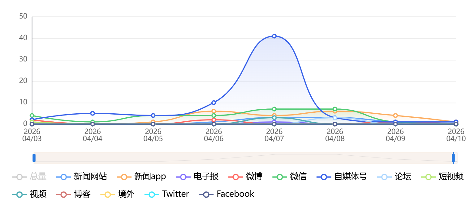 截至目前,该文章在互联网上传播总量为141篇,其中4月7日是信息发布的高峰期。各信源的信息发布情况中,自媒体号信息占比最大,其次是微信和新闻APP,信息量分别为67篇、28篇、24篇,占比分别为47.52%、19.86%、17.02%。(数据来源:新华睿思系统)