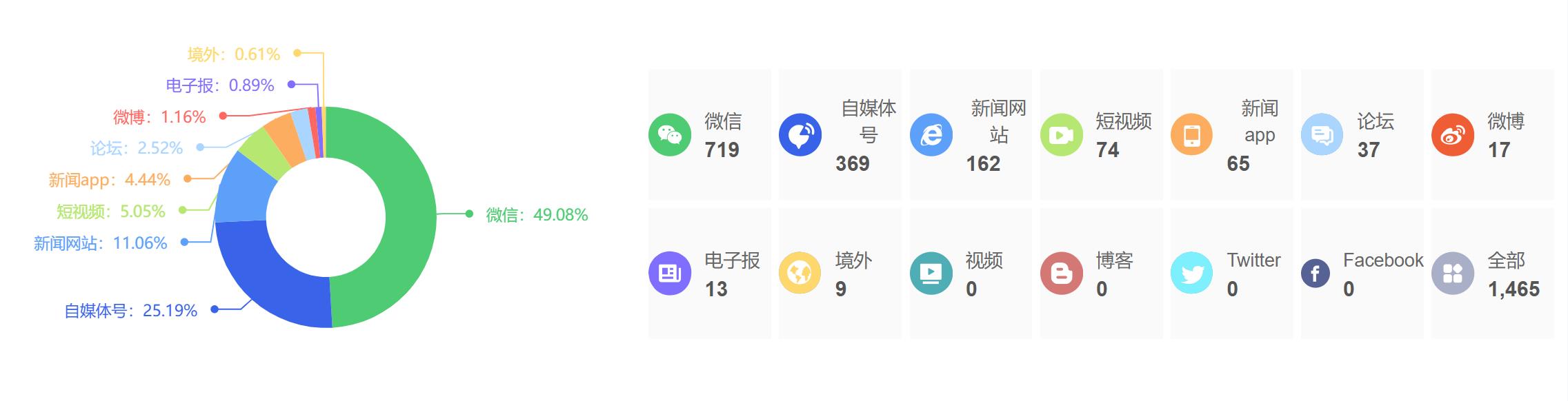 截至目前,该文章在互联网上传播总量为1465篇,其中4月8日是信息发布的高峰期。各信源的信息发布情况中,微信信息占比最大,其次是自媒体号和新闻网站,信息量分别为719篇、369篇、162篇,占比分别为49.08%、25.19%、11.06%。(数据来源:新华睿思系统)