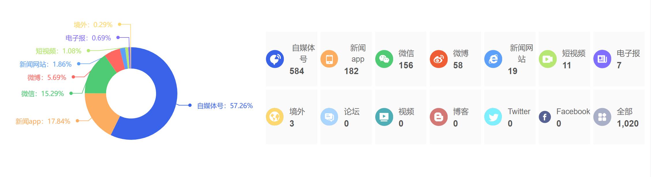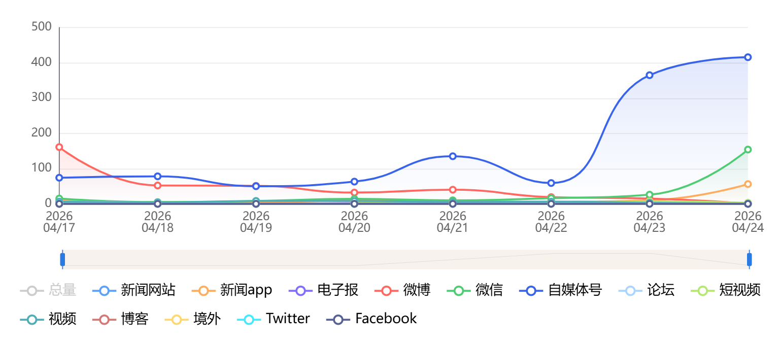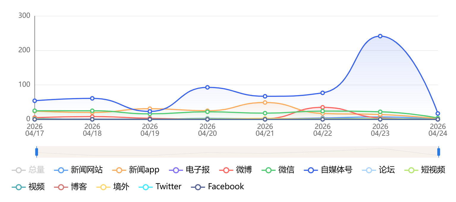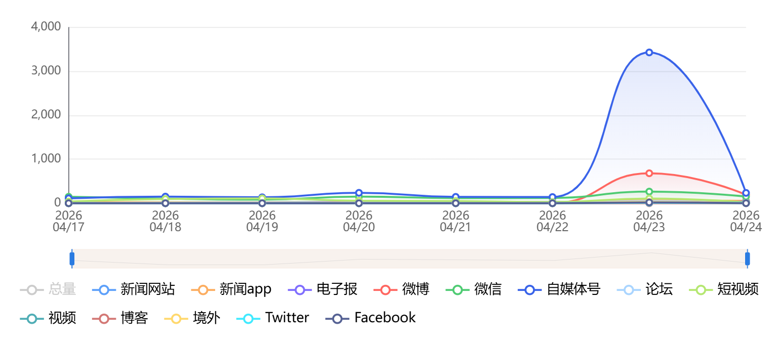 截至目前,该文章在互联网上传播总量为1020篇,其中4月23日是信息发布的高峰期。各信源的信息发布情况中,自媒体号信息占比最大,其次是新闻APP和微信,信息量分别为584篇、182篇、156篇,占比分别为57.26%、17.84%、15.29%。(数据来源:新华睿思系统)