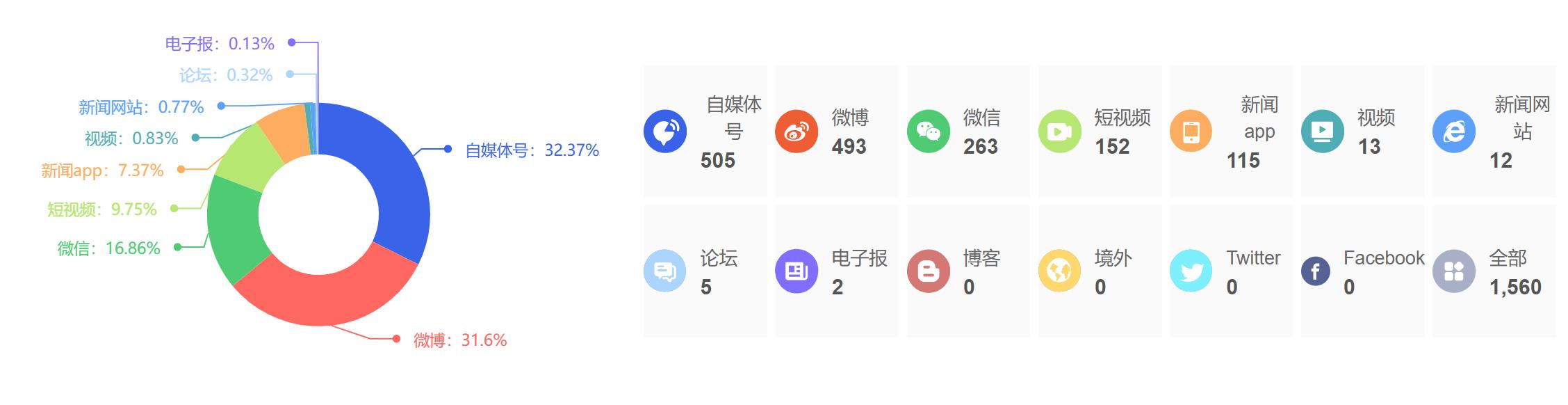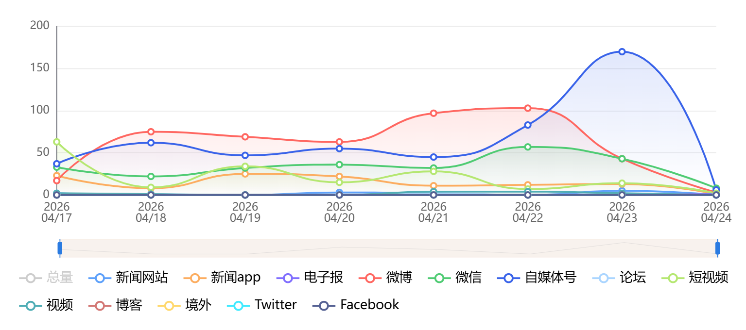 截至目前,该文章在互联网上传播总量为1560篇,其中4月23日是信息发布的高峰期。各信源的信息发布情况中,自媒体号信息占比最大,其次是微博和微信,信息量分别为505篇、493篇、263篇,占比分别为32.37%、31.6%、16.86%。(数据来源:新华睿思系统)