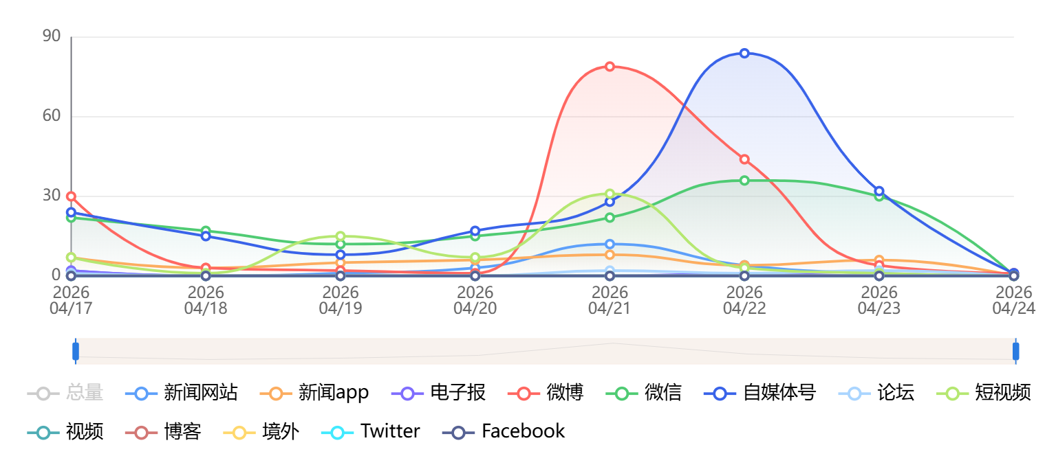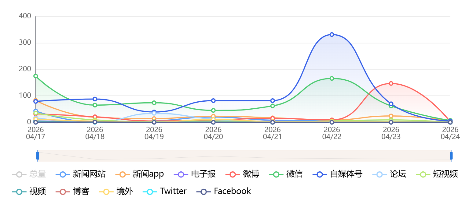 截至目前,该文章在互联网上传播总量为664篇,其中4月22日是信息发布的高峰期。各信源的信息发布情况中,自媒体号信息占比最大,其次是微博和微信,信息量分别为209篇、164篇、154篇,占比分别为31.48%、24.7%、23.19%。(数据来源:新华睿思系统)