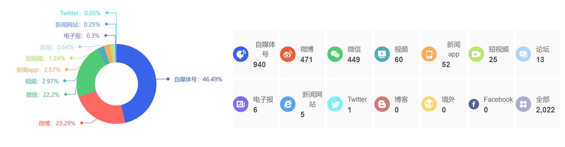 截至目前,该文章在互联网上传播总量为2022篇,其中4月24日是信息发布的高峰期。各信源的信息发布情况中,自媒体号信息占比最大,其次是微博和微信,信息量分别为940篇、471篇、449篇,占比分别为46.49%、23.29%、22.2%。(数据来源:新华睿思系统)