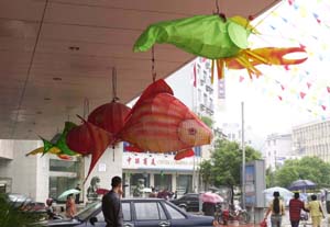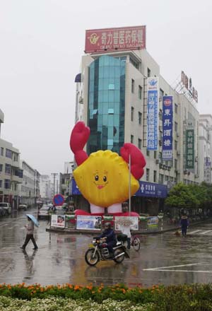 为期两 天的首届三门中国青蟹节9月25日--26日在浙江省三门县举行。该届青蟹节以“新三门、新形象,扬三门青蟹美名,促经济社会发展”为主题,并将举办农产品展览暨经贸科技洽谈会等活动。图为节日期间三门县城街头的喜气景象。