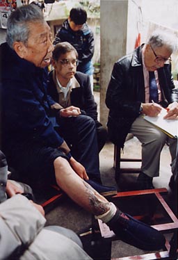 程崇文老人正向美国专家们说明自己右脚感染毒菌60年来浓血不止的情况。 |