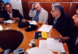 | 2002年3月6日上午,谢尔顿·H·哈里斯(右2)与随行的美国医学专家麦克·法兰兹布劳(右3)、马丁·法曼斯基(右4)在金华市婺城区疾病预防控制中心讨论调查事项。 |
