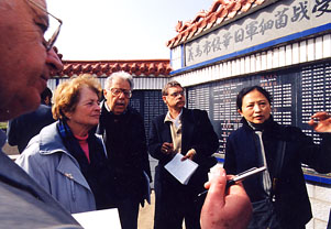 | 2002年3月7日,在曾被日军细菌战夺去1138名同胞的义乌市崇山村“义乌市侵华日军细菌战受害者英烈墙”前,谢尔顿·H·哈里斯(右3)与夫人茜拉·哈里斯(右4)及随行的美国医学专家们正倾听王选介绍60年前众多百姓染疫暴死的惨状。 |