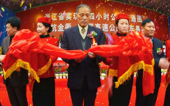 杭金衢高速公路副总指挥徐聿海(中)等人在浙江“四小时公路交通圈”暨杭金衢高速公路、金丽高速公路典礼上剪彩。 |