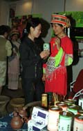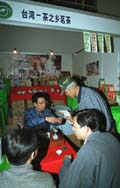 在茶博览交易会上,茶叶制品和茶具等商品的交易频繁。图为台湾展馆的展台前,一位台湾茶商正在与来自韩国的客商洽谈业务。
